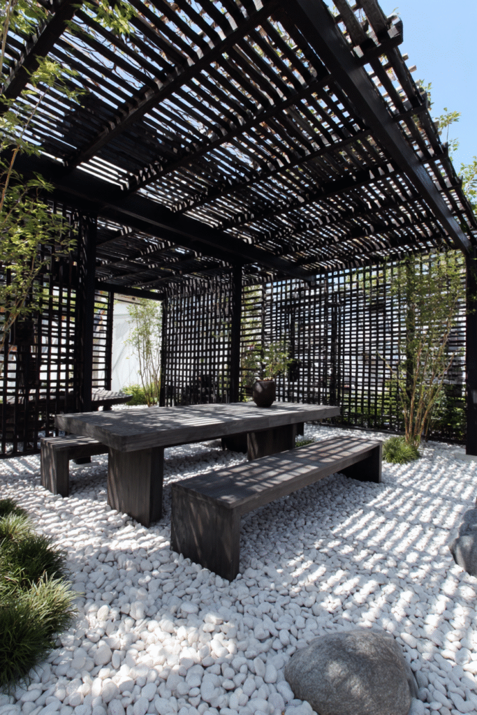 This design is a masterclass in modern minimalism, utilizing a sleek black-stained wood pergola that uses closely spaced beams to create a beautifully patterned shade underneath. The structure covers a monochromatic dining area with simple furniture and is set atop a bed of light, smooth stones, making the whole setting feel very zen and sculptural. The dark stain helps the pergola recede and blend in, making the space feel sophisticated and architectural.