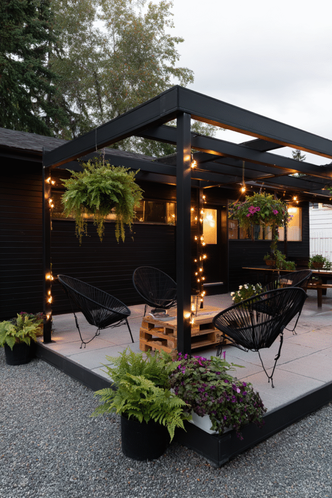 This is a super achievable and charming idea for a smaller yard, featuring a compact, dark-stained wooden pergola that defines a cozy little seating nook. The pergola uses simple, clean construction and is beautifully dressed up with soft string lighting and lush hanging ferns, which instantly transform it into an intimate evening retreat. The black color provides a lovely contrast for the greenery and the warm lighting, making it feel extra inviting.