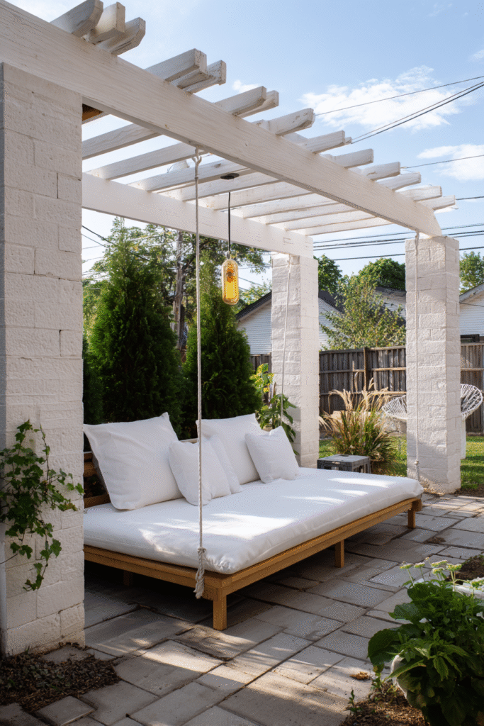 I absolutely adore how this design uses the cheapest material—simple fabric—to create the biggest style impact; it’s such a brilliant DIY luxury hack! The white fabric catches the light so beautifully and moves in the breeze, making the whole area feel dreamy and ethereal. If you want a pergola that feels instantly romantic, luxurious, and totally photogenic, draping is the perfect, budget-friendly way to go!