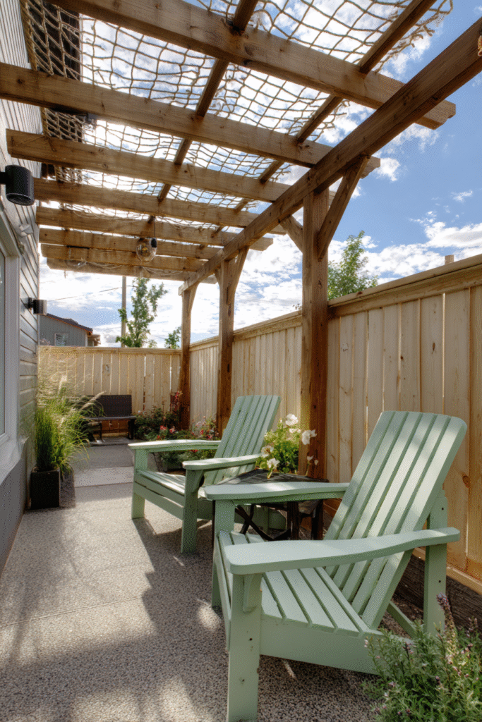This simple, natural wood pergola shows off its rustic, charming construction, featuring thick posts and exposed beams that celebrate the beauty of raw materials. The shade is minimal, allowing plenty of sun through, and the structure is complemented by a cheerful pair of light green Adirondack chairs and a simple fence background. It’s a casual, unpretentious design that is all about comfortable, laid-back relaxation.