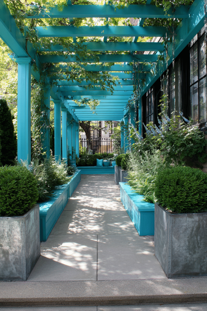 Talk about a showstopper, this design uses a basic wood pergola but hits it with a coat of vibrant, intense teal paint to create an incredible focal point in the garden. The brightly colored structure stands out beautifully against the clean gray planters and the surrounding green foliage, covering a pathway or seating area. This bold color choice gives a simple pergola an immediate, high-style, modern courtyard vibe.