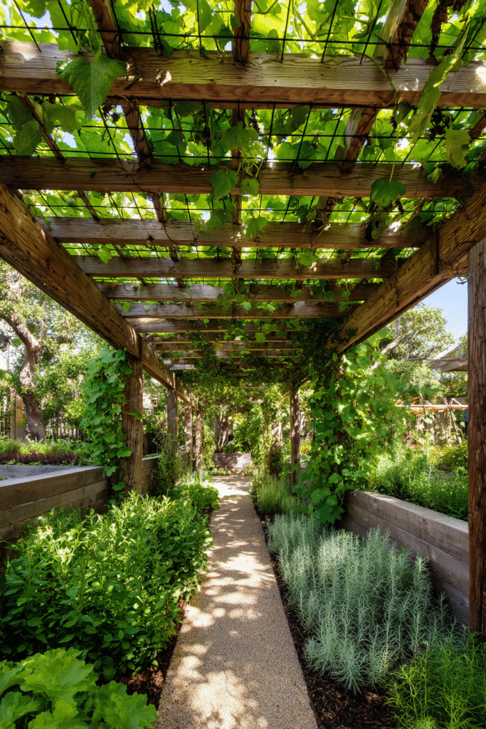 This is such a lovely and practical idea, featuring a strong dark-stained wood pergola with a lattice of grape vines or other edible plants growing overhead to provide natural shade. The structure is set over a charming, lush walkway or sitting area surrounded by beautiful garden beds filled with fragrant herbs and flowers. It perfectly blends a functional outdoor room with a productive, beautiful garden space.