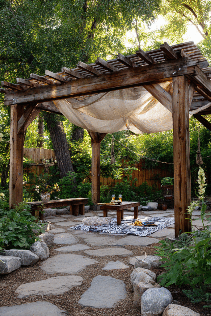 This charming design uses a simple, chunky wood pergola frame that is softened dramatically by a draped, off-white fabric canopy creating a wonderfully cozy, shaded nook. The fabric creates a beautiful billowing shape that provides excellent sun coverage and instantly elevates the space from basic to bohemian chic. Set over a whimsical stone path and low seating, it’s surrounded by lush, untamed greenery for a truly relaxing feel.