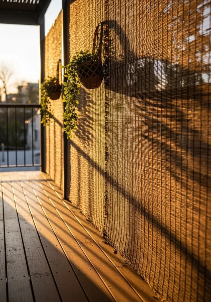 This outdoor privacy screen uses woven bamboo panels mounted along a narrow deck, creating a warm and softly textured barrier that instantly feels relaxed. The natural fibers let light filter through just enough to cast gentle shadows across the wooden floor, while hanging planters and climbing greenery add a casual boho touch that keeps the space from feeling closed in. Everything feels sun washed and easy, like a quiet corner made for slow mornings and peaceful pauses.