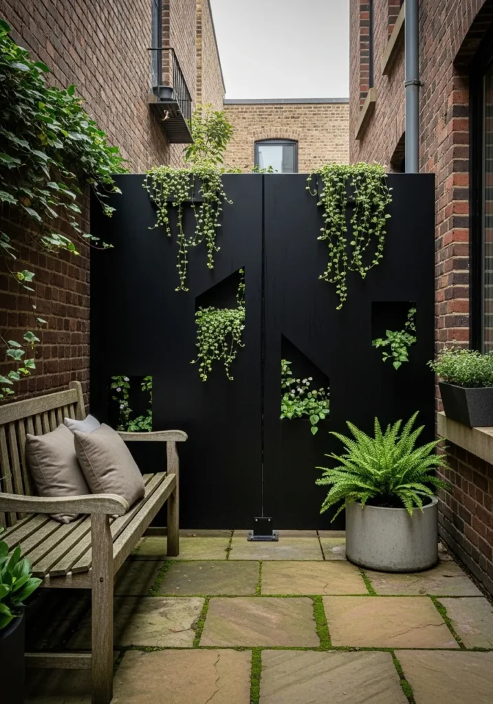 This narrow courtyard uses matte black privacy panels to block neighboring views while still feeling stylish. Small climbing plants trail upward against the dark surface, adding life and contrast. The panels create a strong backdrop for simple seating and soft stone flooring. The overall feel is modern, cozy, and surprisingly inviting.