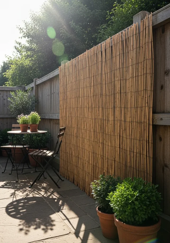 This outdoor area features a bamboo privacy fence that adds texture and warmth to the space. The natural material filters sunlight and creates beautiful shadows across the patio. Potted plants soften the edges and help the fence blend into the garden. Everything feels sun kissed and easygoing.