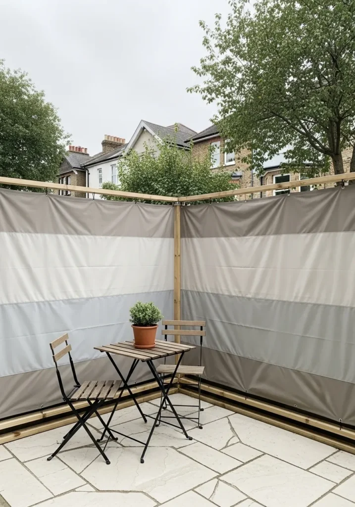This design wraps fabric privacy panels around a small patio corner to create a tucked away seating area. The soft neutral fabric is stretched neatly across a wooden frame, giving structure without stiffness. Simple bistro furniture fits perfectly inside the space and keeps it feeling open and relaxed. It feels like a little outdoor room.