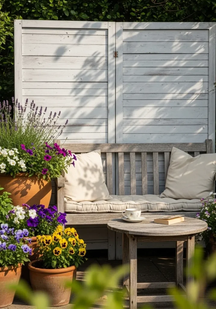 This design features a painted wood privacy screen paired with lush potted flowers and soft seating. The light color keeps the space feeling bright while still offering coverage from nearby views. Layered plants bring in color and texture, making the area feel cheerful and welcoming. It has a sweet and slightly nostalgic vibe.