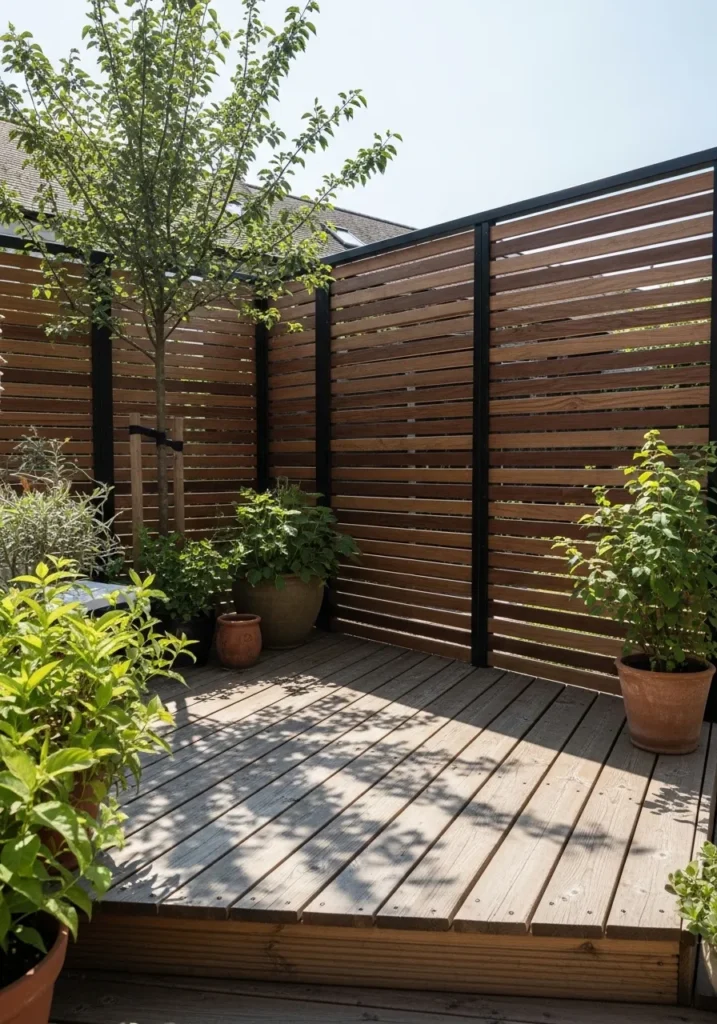 This setup uses horizontal wooden slats to create a private garden corner that still feels open. The warm wood tones blend beautifully with surrounding greenery and potted plants. Light filters through the slats and adds softness to the space. It feels grounded and natural.