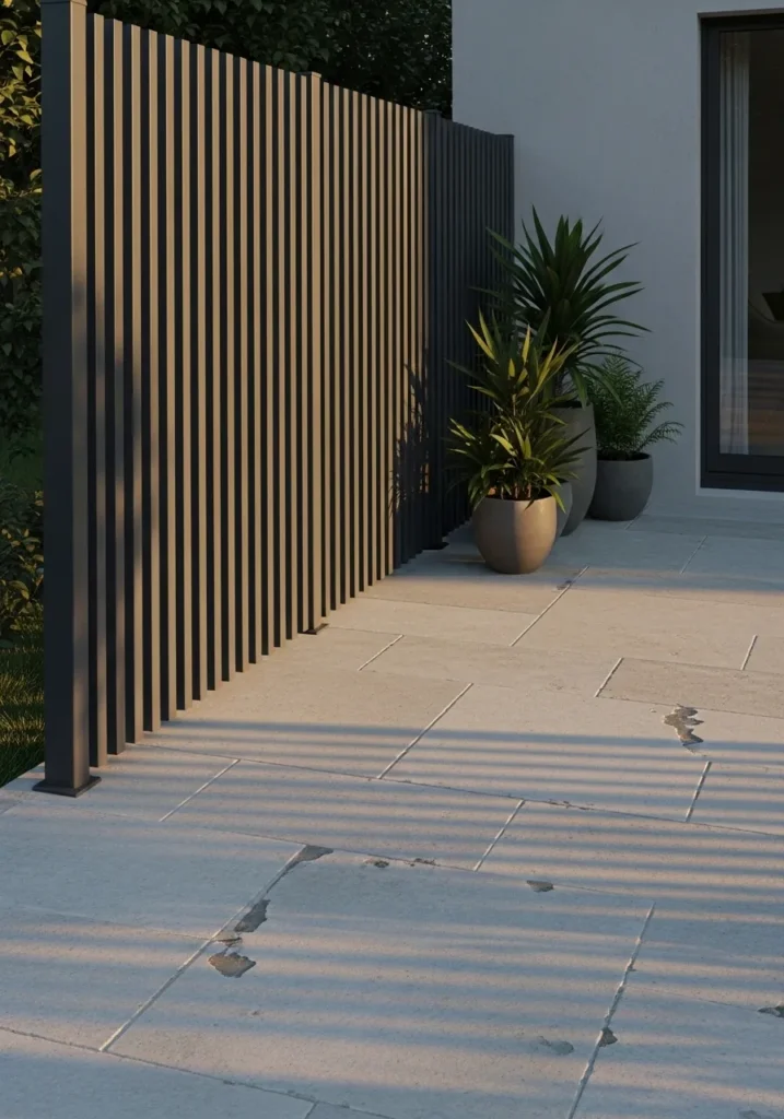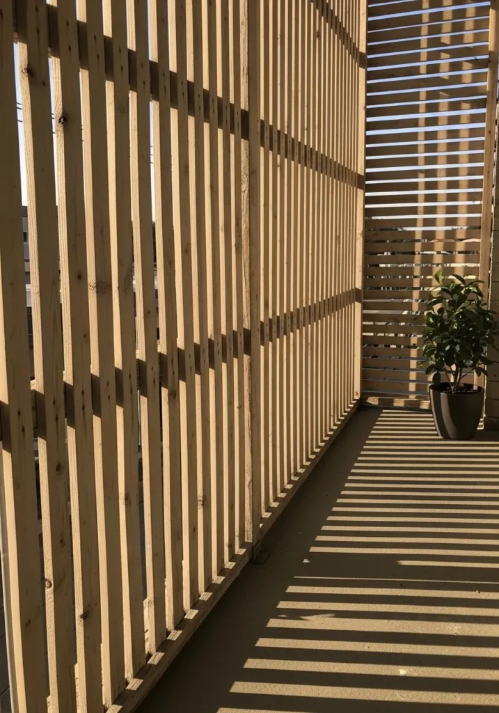 This design uses tall vertical slats in a darker finish to create a sleek and modern privacy screen. The clean lines work beautifully with light stone flooring and simple potted plants. Everything feels intentional and uncluttered. It gives the space a polished look without feeling cold.
