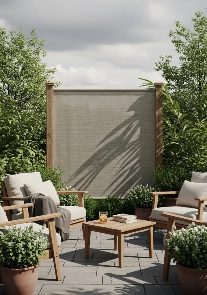 This setup features a neutral fabric privacy panel stretched between wooden posts and surrounded by lush plants. The fabric creates a gentle visual break while still letting light filter through. Cozy seating and low greenery keep the space feeling balanced and inviting. It feels like a little outdoor living room tucked into the garden.