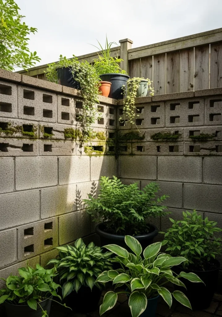 This outdoor corner uses a concrete block wall as a privacy screen, softened with plants tucked into the openings. The solid structure provides full coverage while the greenery brings in texture and life. Sunlight hits the wall just right and highlights the contrast between hard and soft elements. It feels urban but still natural.