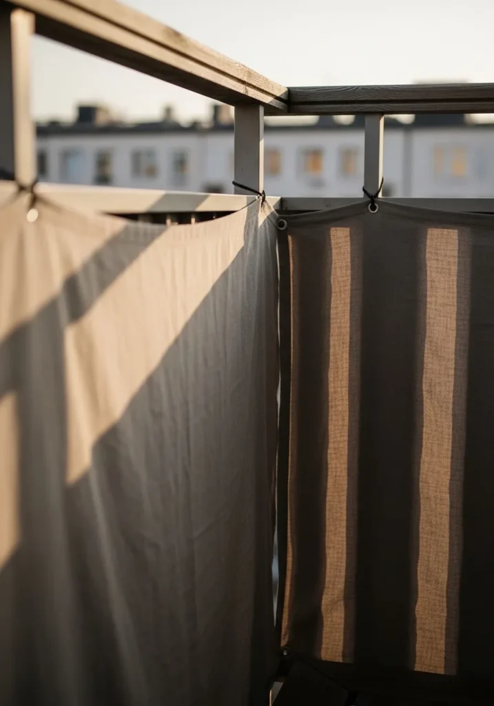 This setup uses fabric panels hung from a simple outdoor frame to create a gentle and flexible privacy barrier. The fabric drapes naturally and moves slightly with the breeze, which adds softness to the space. Neutral tones help it blend easily with modern outdoor furniture, making it perfect for patios or balconies that need adjustable coverage.