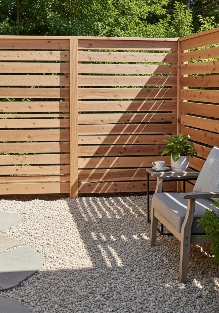 This design features horizontal wooden slats that create privacy while keeping the area visually open. Warm wood tones pair beautifully with gravel flooring and simple seating, giving the space a grounded and natural feel. Light slips through the gaps between the slats, adding depth and subtle contrast throughout the day.