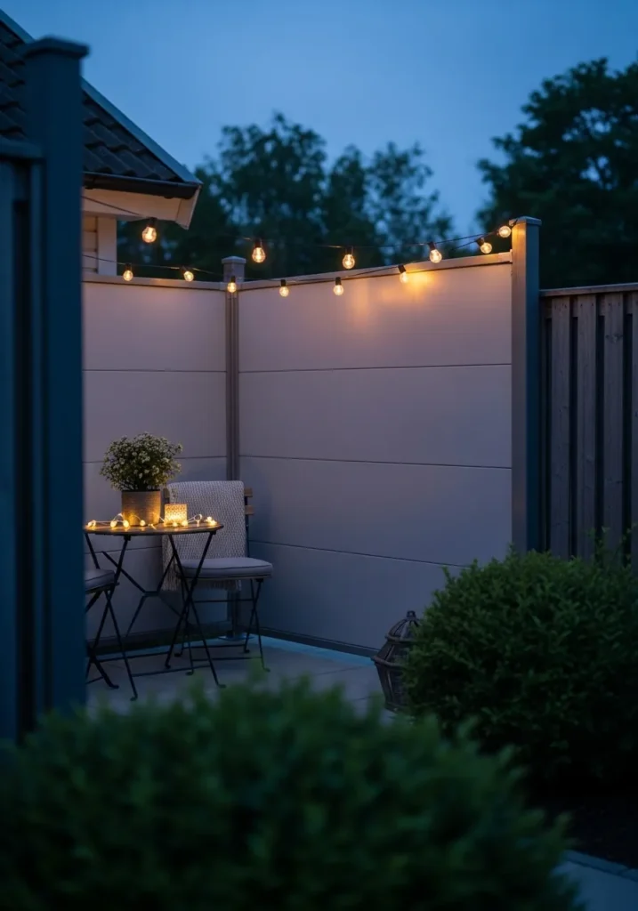 This privacy screen uses smooth panels in a soft neutral shade, paired with gentle outdoor lighting to create a calm atmosphere. String lights and small plants add warmth and charm to the compact patio, while the panels block neighboring views without making the space feel closed in. The overall look is clean, modern, and quietly cozy.