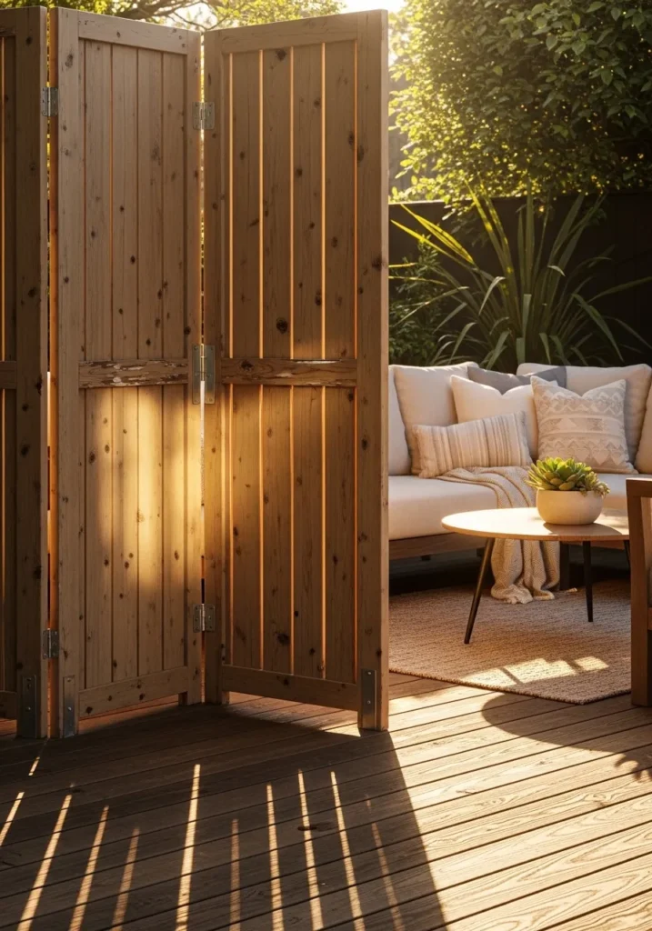 This design features a folding wooden privacy screen that can be adjusted depending on the moment. The vertical boards add warmth and texture while still feeling lightweight. It works perfectly on a patio where flexibility matters. The wood pairs easily with simple outdoor furniture.
