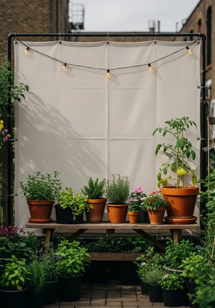 This cozy setup uses a simple fabric panel stretched across a frame to create privacy in a small garden nook. Terracotta pots filled with leafy plants sit neatly in front, adding texture and color. The soft fabric backdrop makes the greenery stand out even more. It feels casual and relaxed, like a little hidden garden moment.