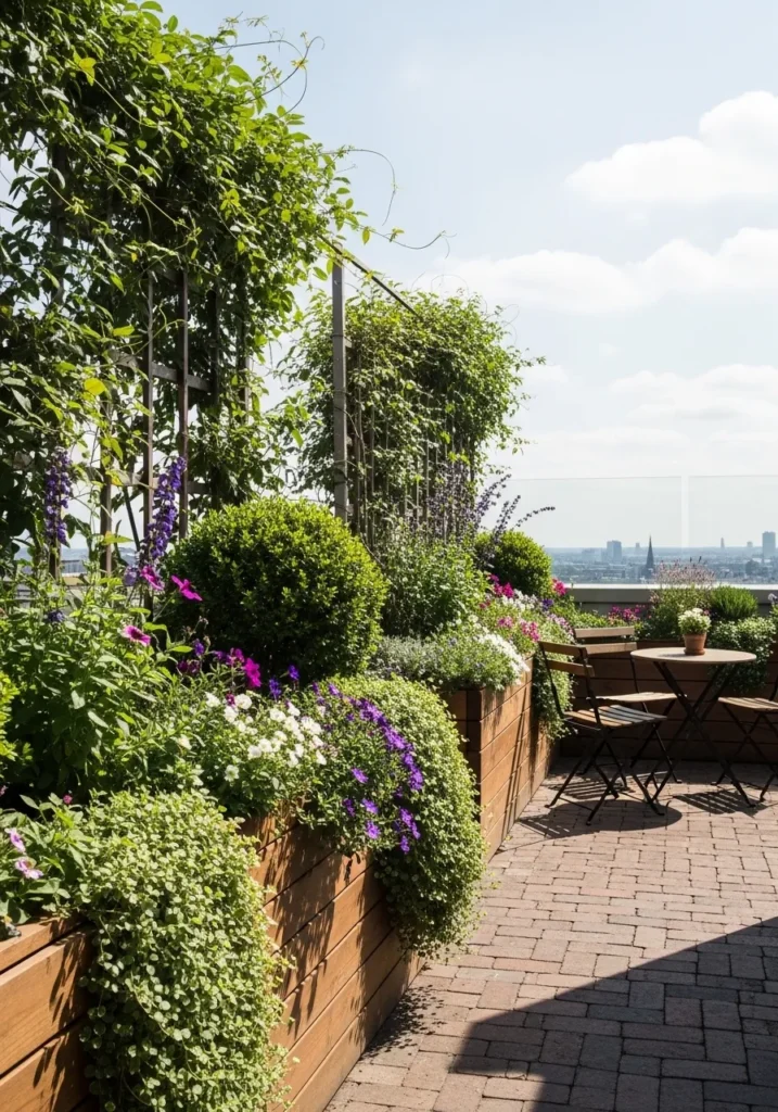 I am such a fan of vertical gardens on rooftops. They add instant depth and texture. This design feels intimate and stylish, like a private retreat floating above the busy streets.