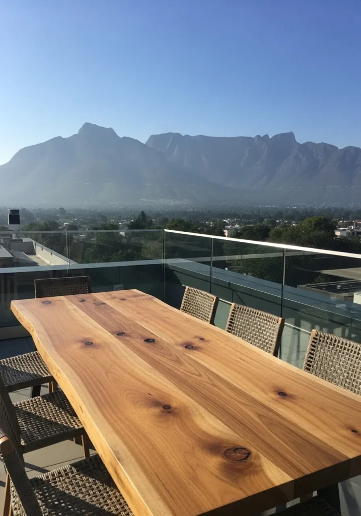 This terrace centers around a thick live edge wooden dining table placed beside a sleek glass railing. The natural wood grain stands out beautifully against the clean lines of the balcony and the dramatic mountain range in the distance. The setting feels open and fresh, with the table becoming the hero piece of the space.