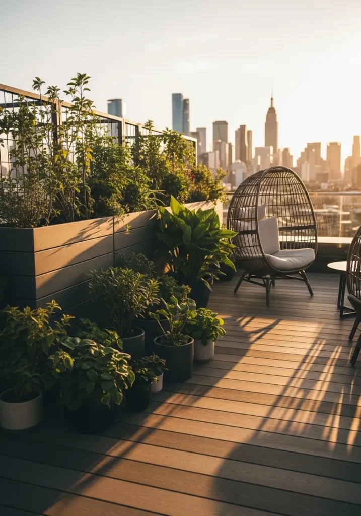 This rooftop corner features layered greenery in large planters, a woven egg chair, and a wooden deck bathed in warm golden light. The skyline rises softly in the background, slightly hazy as the sun sets. The greenery frames the seating area beautifully and makes the space feel cozy and secluded.