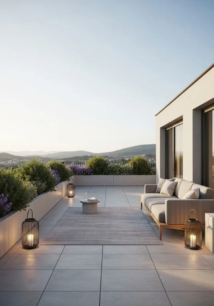 This rooftop is designed with large pale stone tiles and built in bench seating along the edges. Soft neutral cushions line the benches, and simple lanterns glow gently along the floor. The distant hills and sky create a calm, expansive backdrop that feels endlessly peaceful.