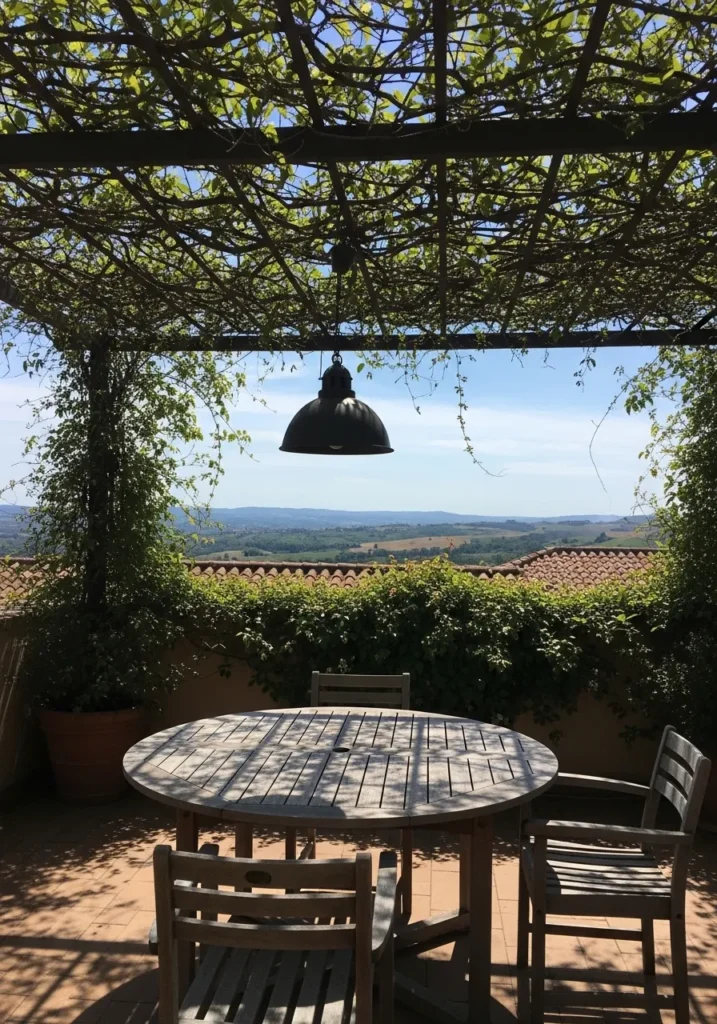 This rooftop dining area sits beneath a pergola wrapped in leafy vines that create natural shade. A round wooden table with simple chairs rests on a tiled floor, overlooking rolling countryside views. The greenery above filters the sunlight beautifully, casting soft shadows across the table.