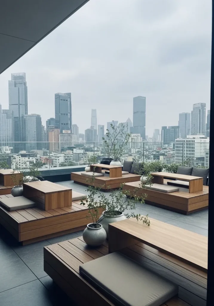 This terrace is styled with layered wooden platforms that create subtle levels for seating and planters. Low modern furniture in soft neutral tones keeps the design sleek and balanced. The city skyline rises in the distance beneath a slightly overcast sky, adding a moody touch.