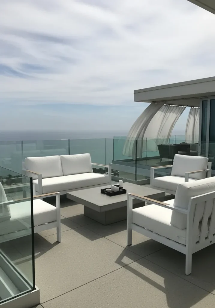 This terrace leans into clean lines and modern simplicity, with crisp white cushioned armchairs and a low matching table set against a clear glass railing. The neutral tiled flooring and soft cloudy sky create a calm, airy atmosphere. The open view stretches endlessly, making the furniture feel like it is floating above the city.