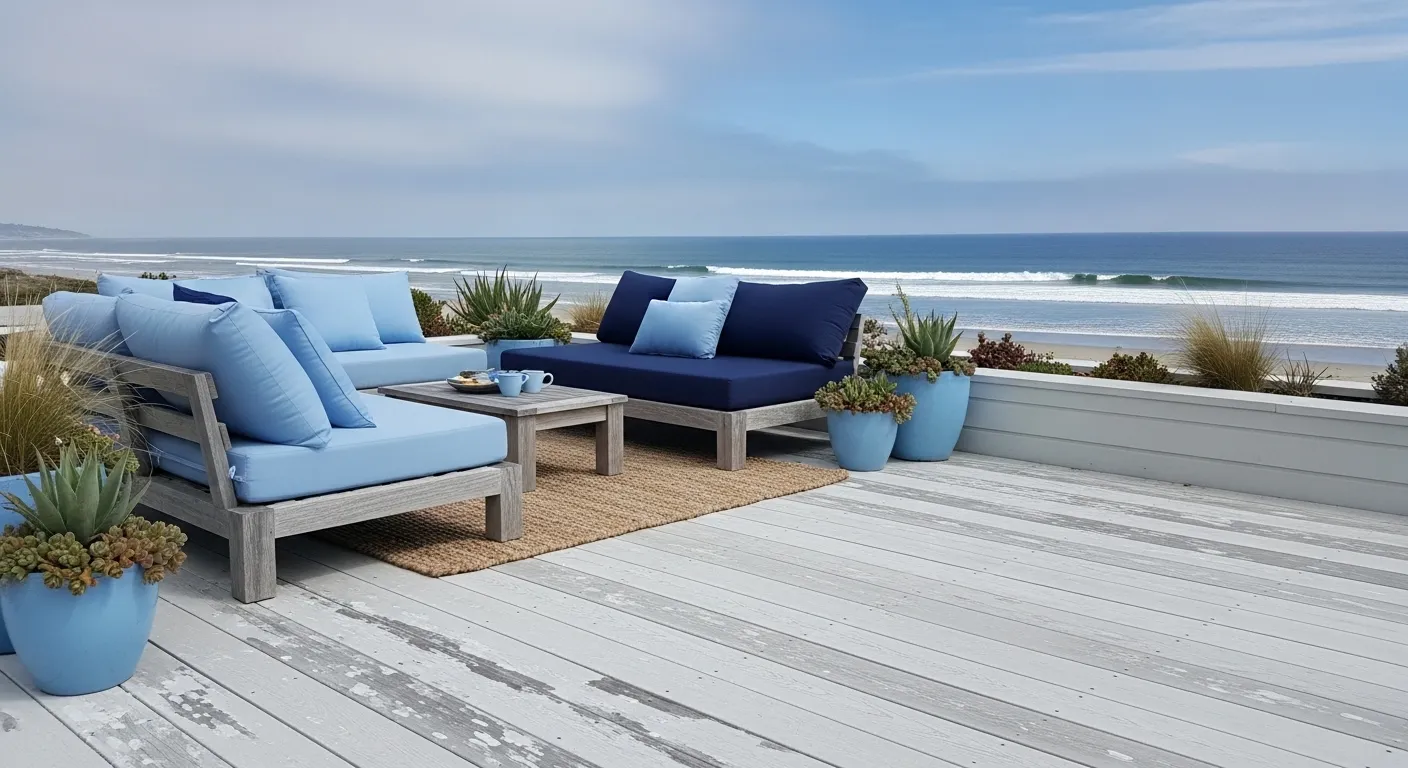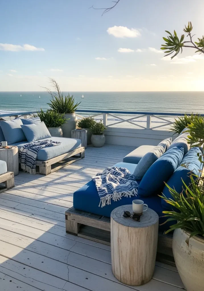This terrace leans into soft coastal vibes with light wood decking and plush seating in shades of blue. Large ceramic planters and simple side tables complete the relaxed arrangement. The ocean horizon sits just beyond the railing, creating a peaceful and breezy backdrop.