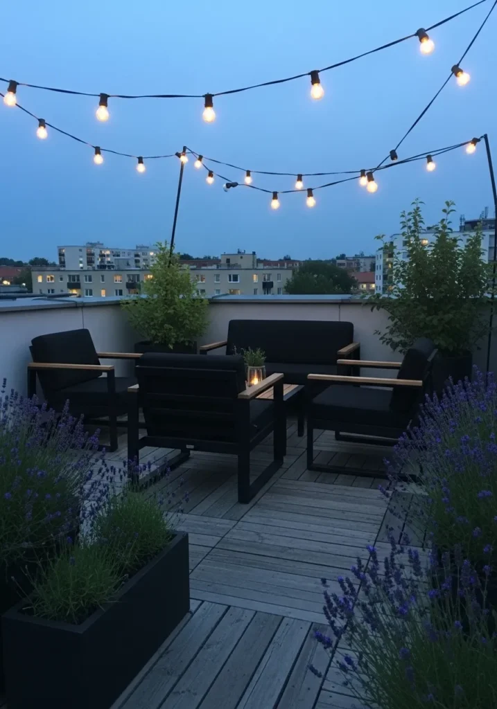 This rooftop terrace is styled with dark outdoor seating, wood decking, and lush planters framing the edges. Overhead, warm string lights are draped casually, glowing against a soft blue evening sky. The seating area feels intimate, with layered greenery adding texture and depth.