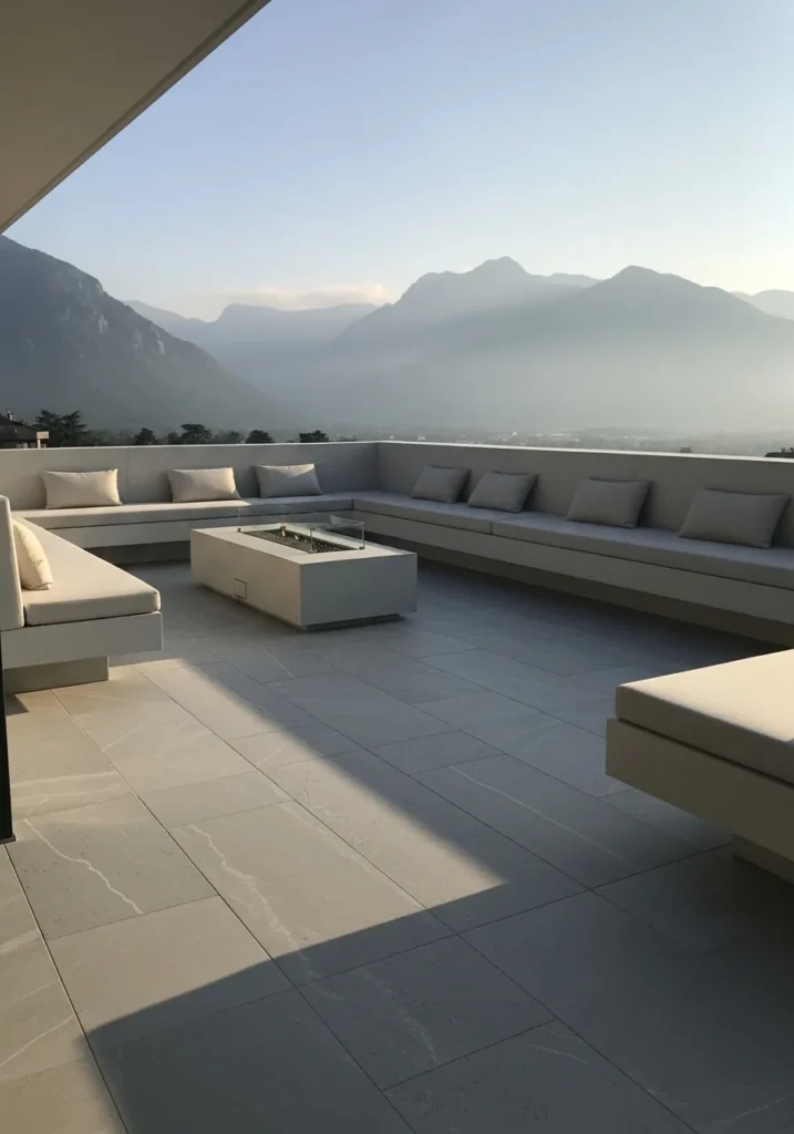 Here we see a spacious rooftop with large stone tiles and built in bench seating wrapped around the perimeter. The cushions are neutral and understated, allowing the distant mountain views to take center stage. The overall look is minimal, clean, and quietly luxurious.
