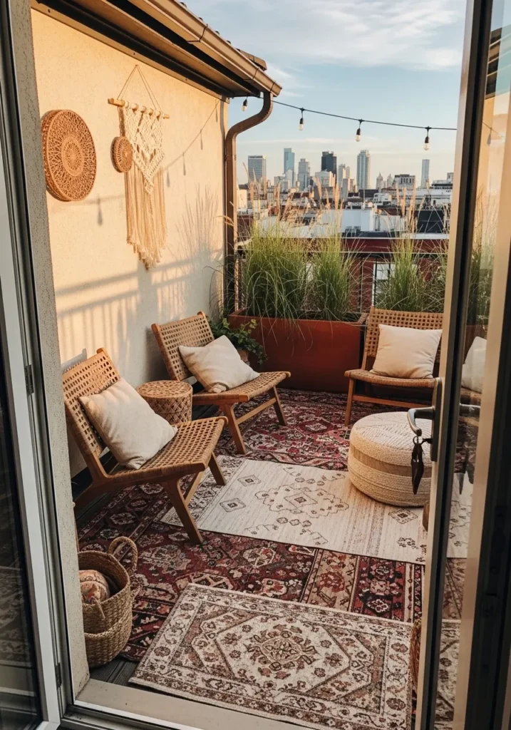 This terrace feels layered and relaxed, with patterned outdoor rugs, warm toned cushions, and a mix of textures that create a cozy nook. The city skyline peeks through in the background, adding contrast to the earthy decor. The seating is arranged to feel intimate and inviting.
