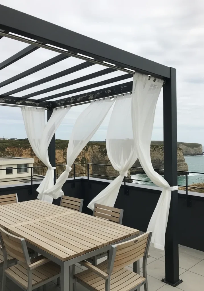 A sleek black pergola frames this rooftop dining space, complete with a light wood table and matching chairs. Sheer white curtains hang loosely, moving gently in the breeze. The open sky and distant water views give the whole setup a breezy elegance.