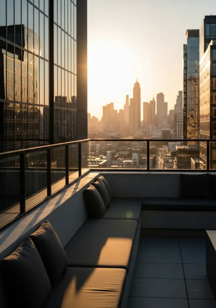 This rooftop corner is wrapped in tall glass panels that reflect the warm sunset light. A built in bench with deep cushions runs along the edge, perfectly positioned to face the skyline. The golden tones of the city create a soft, romantic atmosphere.