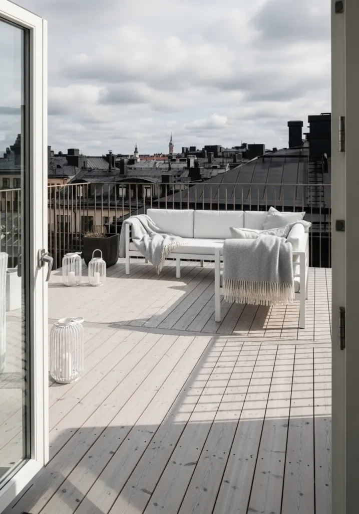 This rooftop terrace features light painted wood decking paired with a crisp white outdoor sofa dressed in soft gray throws and textured pillows. Minimal lanterns sit casually on the floor, adding subtle charm without cluttering the space. The open doors frame the terrace beautifully, leading the eye toward classic rooftops and a cloudy sky that gives the entire scene a calm, muted palette.