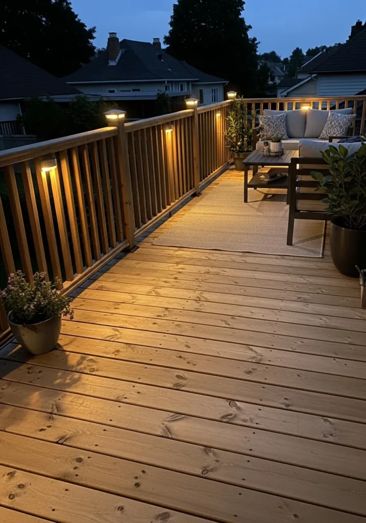 This long wooden terrace stretches out with rich deck boards that show natural grain and slight weathering. Small integrated lights sit along the railing posts, casting a soft amber glow that gently washes over the planks. Simple outdoor chairs and a small table are placed casually along the side, while neighboring homes sit quietly in the background under a deepening blue sky.