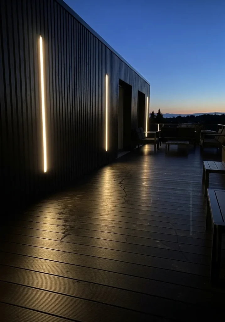 This striking terrace design features tall vertical light strips mounted against a dark exterior wall. The slim beams of light create a bold contrast against the deep tones of the building and the wooden deck below. The surrounding sky is almost fully dark, allowing the lighting to take center stage.