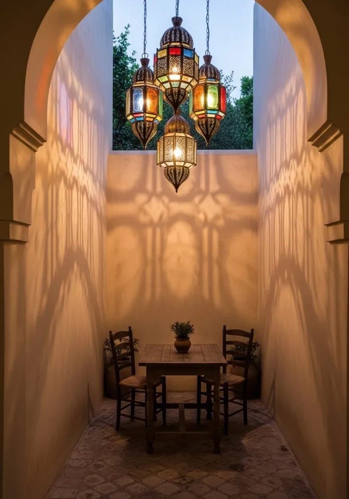 This narrow terrace nook is framed by a soft arched ceiling that instantly gives it a romantic, tucked away feeling. Colorful Moroccan lanterns hang overhead, casting intricate patterns across the warm cream walls. A small round table with simple wooden chairs sits beneath the glow, creating an intimate little corner that feels almost like a hidden café.