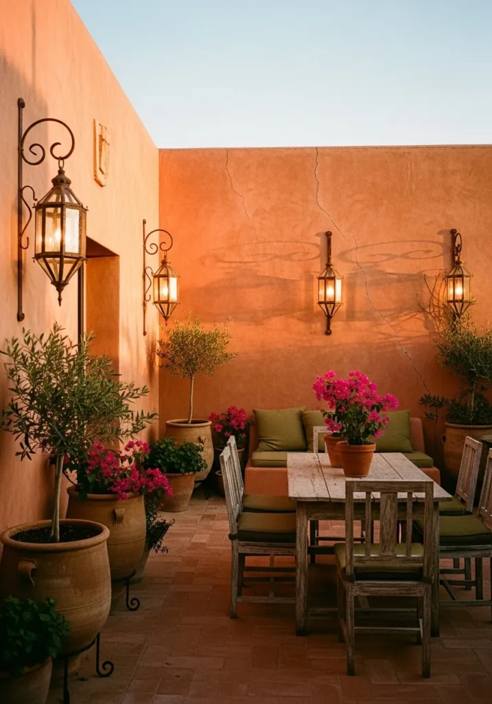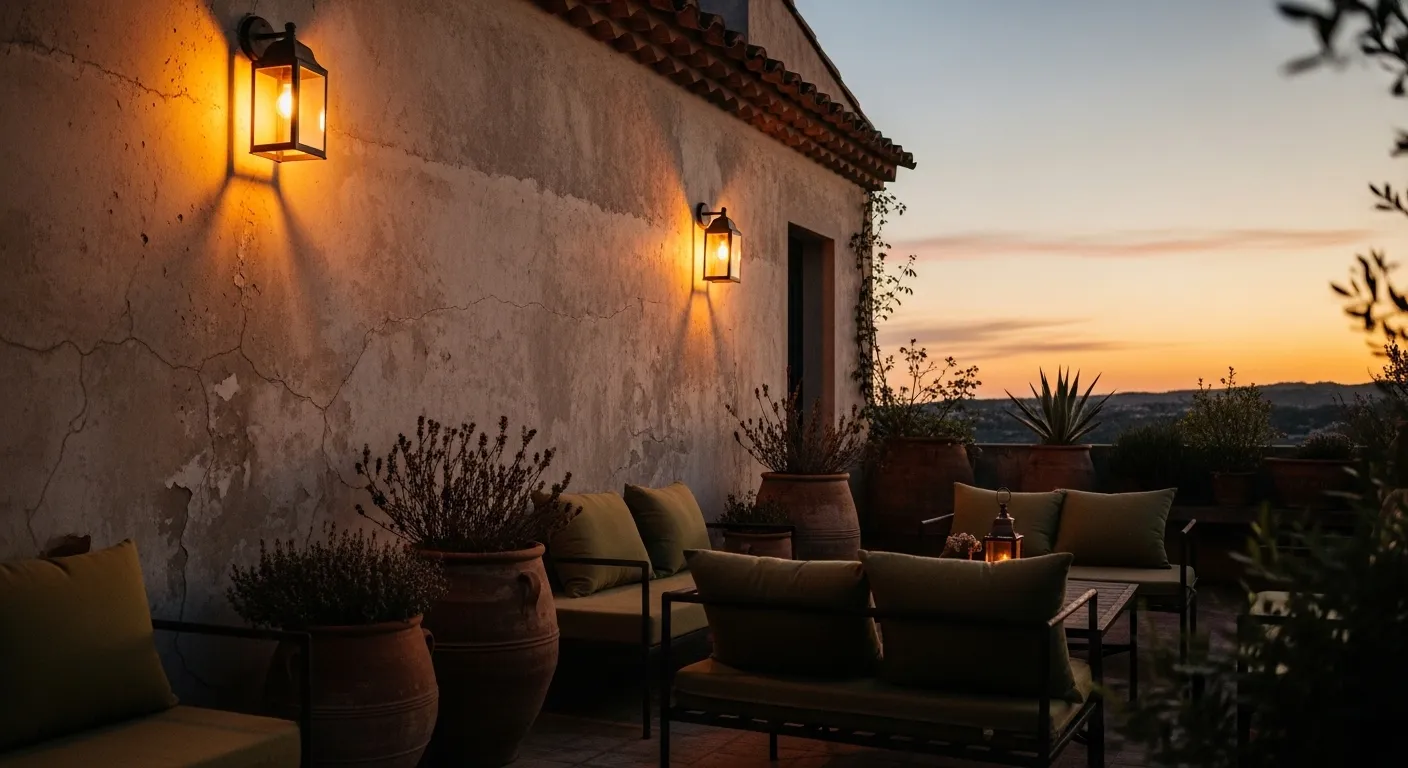 This terrace features textured warm toned walls paired with traditional black lantern sconces. A simple wooden dining table sits in the center, surrounded by potted plants and soft evening light. The lanterns cast a golden wash across the stucco, enhancing every subtle texture.