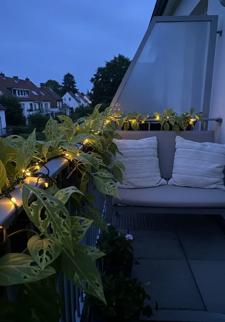 I love how effortless this setup feels. It proves that a simple strand of lights can completely transform a sleek balcony into a dreamy evening retreat. If you are like me and want something chic but not overcomplicated, this kind of lighting is pure magic.
