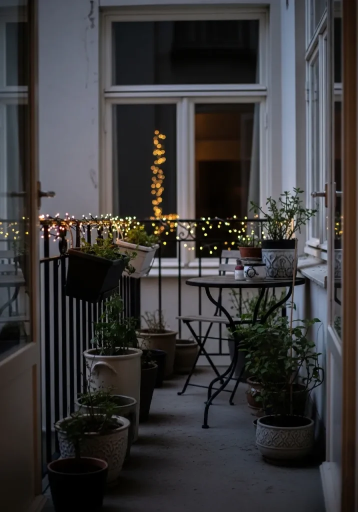 This narrow balcony feels intimate and charming with its small bistro table, slim railing, and clusters of potted plants lining the floor. Tiny fairy lights wrap around the railing and softly frame the open doors, adding a warm sparkle to the compact space. The soft glow reflects gently on the window glass, making the whole corner feel inviting and personal.