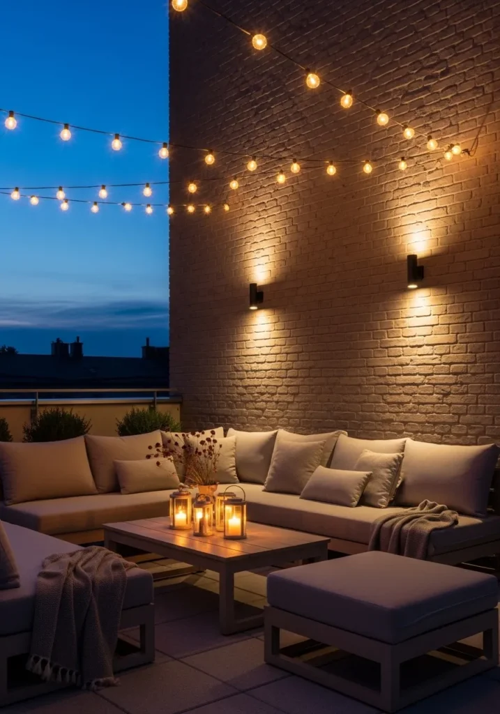 My own terrace completely changed the moment I added soft wall lanterns and a few twinkling string lights.