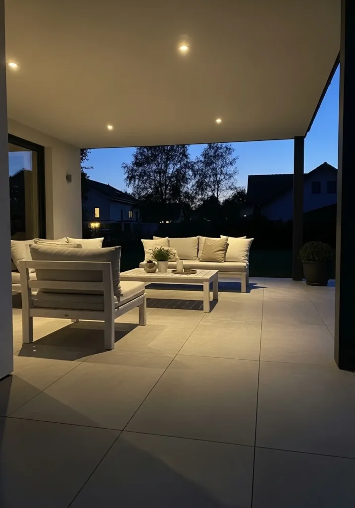This modern terrace features a clean white ceiling with small recessed lights evenly spaced above a pale outdoor seating set. The lighting is subtle but effective, casting an even glow across the tiled floor. The open sides reveal a darkening sky that enhances the calm atmosphere.
