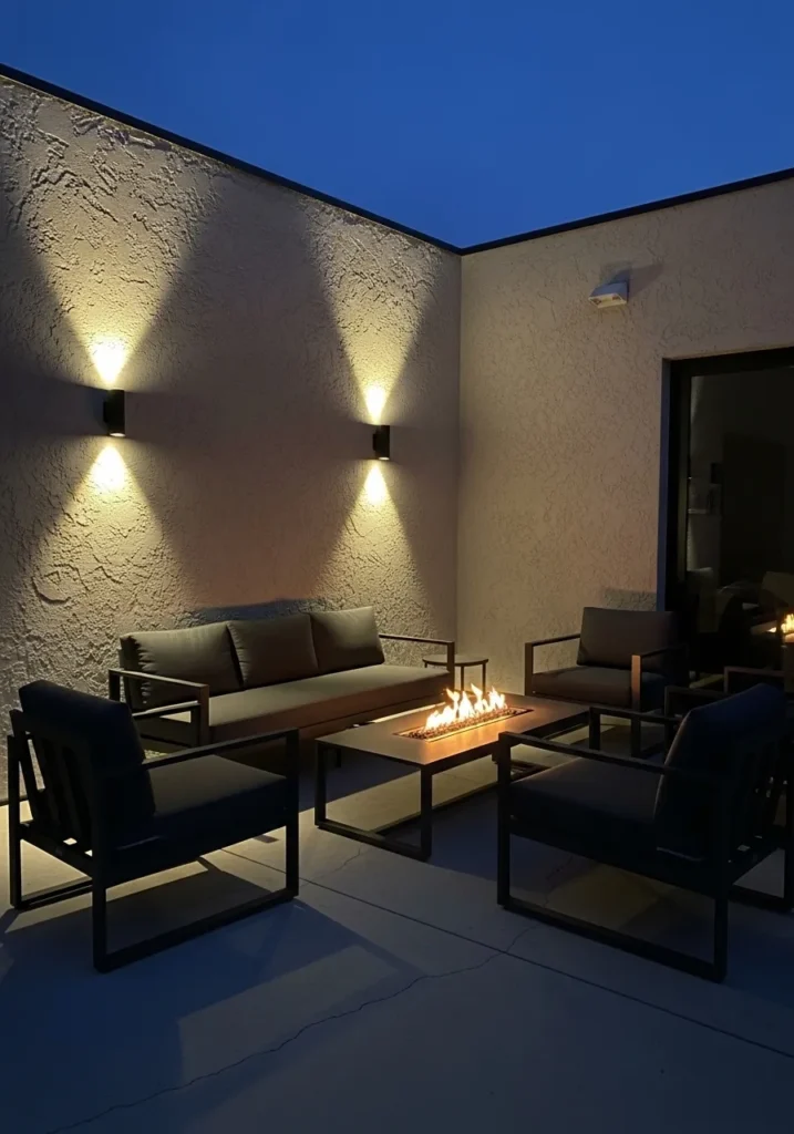 This sleek terrace uses geometric wall sconces to cast upward and downward beams against smooth cream walls. The outdoor seating is simple and dark, letting the lighting become the true focal point. The evening sky deepens above, while the light patterns create visual interest without clutter.