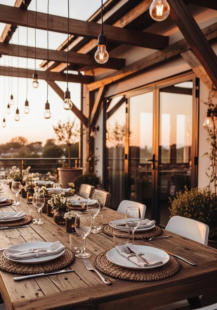 A wooden pergola frames this terrace dining space, with exposed beams supporting a row of glowing Edison bulbs. The long rustic table is set with layered plates and glassware, catching the warm light beautifully. Soft sunset tones filter through the structure, blending with the amber glow overhead.