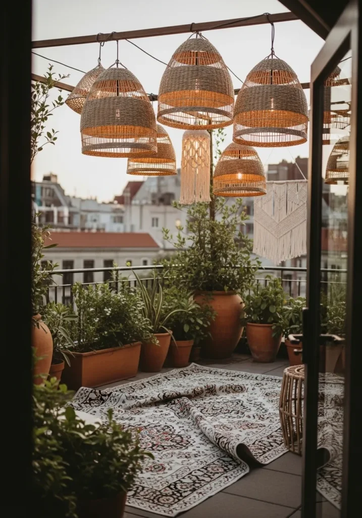 This terrace embraces a relaxed bohemian vibe with woven rattan pendant lights hanging at different heights. A patterned outdoor rug softens the floor, while potted plants and cozy seating add texture and warmth. The golden light filtering through the woven shades creates a dreamy glow across the space.