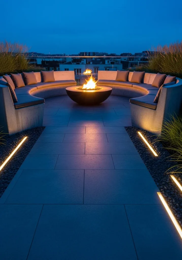 This modern rooftop terrace centers around a round fire bowl that flickers warmly against the cool blue tones of dusk. Curved built in seating wraps around the fire feature, layered with soft neutral cushions. Slim linear lights are embedded into the floor on both sides of the walkway, guiding the eye toward the glowing centerpiece while adding a sleek architectural touch.