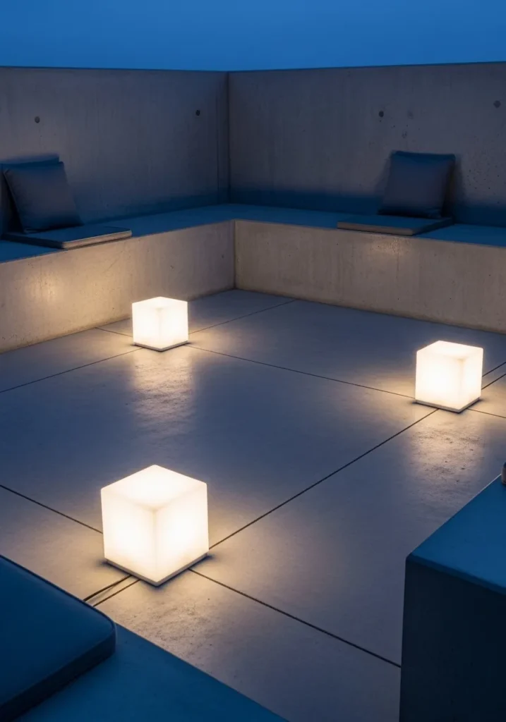 This open terrace features smooth light tiles and low seating arranged around glowing cube floor lamps. The soft white cubes create gentle pools of light across the floor, adding dimension without overpowering the space. The deep blue evening sky above enhances the crisp, modern look.