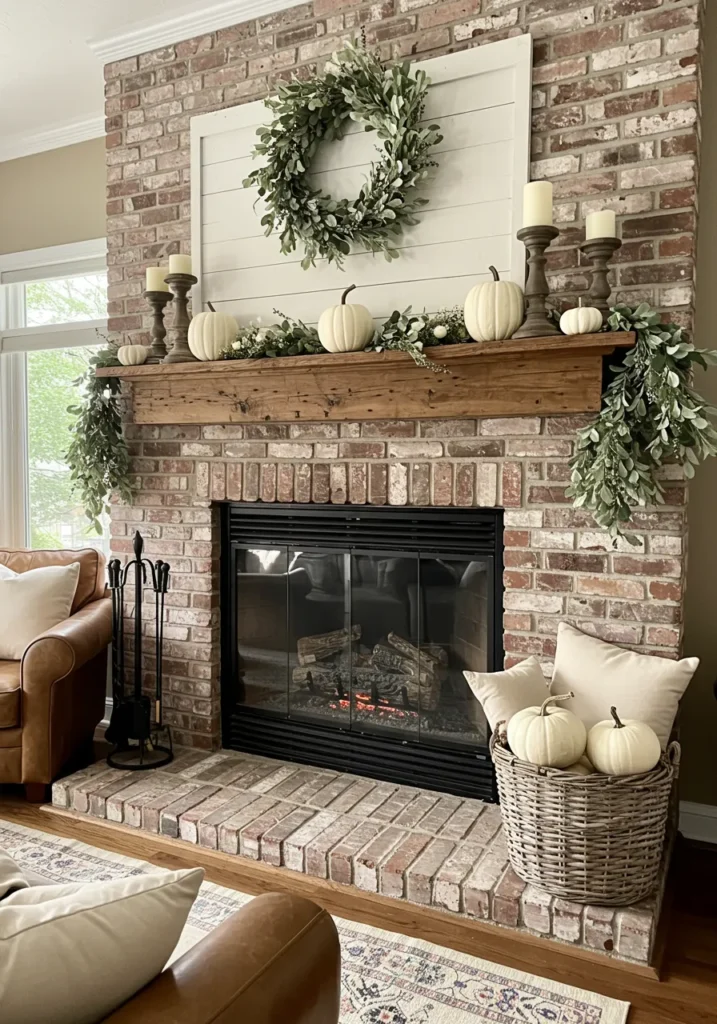 This farmhouse-style fireplace nails the balance between rustic and refined. The red brick and natural wood mantel bring cozy character, while the greenery, white pumpkins, and wooden candlesticks add a soft, neutral palette that feels fresh and modern. The woven basket full of pumpkins and pillows beside the hearth adds that lived-in charm that makes a home feel real.
