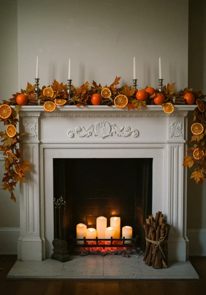 This classic white fireplace feels like a storybook moment. A garland made of autumn leaves, dried orange slices, and cinnamon sticks drapes elegantly across the mantel, paired with glowing pillar candles and silver candlesticks. The dried fruit gives a beautiful pop of color that feels warm and nostalgic.